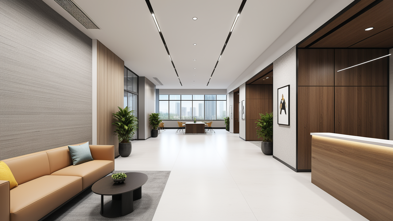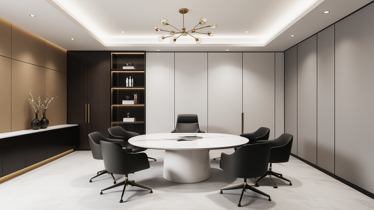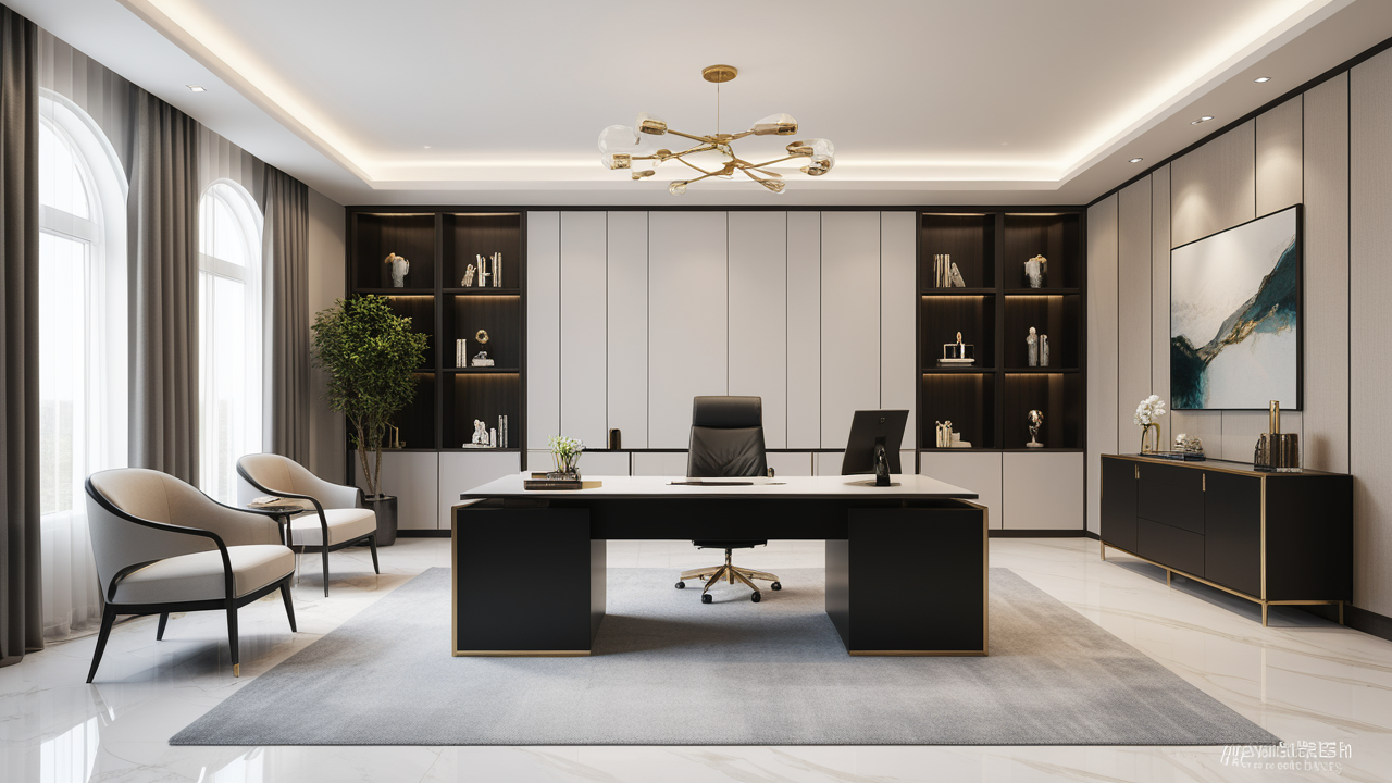 本案設(shè)計中考慮總經(jīng)理的辦公室空間布局時,因?qū)λ麨槿藝?yán)謹(jǐn)、負(fù)責(zé)、勤儉的優(yōu)良品行有所了解,特摒棄了一切繁文縟節(jié)的矯飾,一切盡在實用、明快而流暢的格局中;配合現(xiàn)代辦公環(huán)境的追求,設(shè)置實用與展示性相結(jié)合的整墻書柜,旁倚商務(wù)型老板桌,既陳設(shè)精雅、品味清亮、格調(diào)一致,又可于繁忙后賞窗外風(fēng)光、待客會友;簡潔的吊頂,照顧到了辦公、會客區(qū)的燈光劃分。