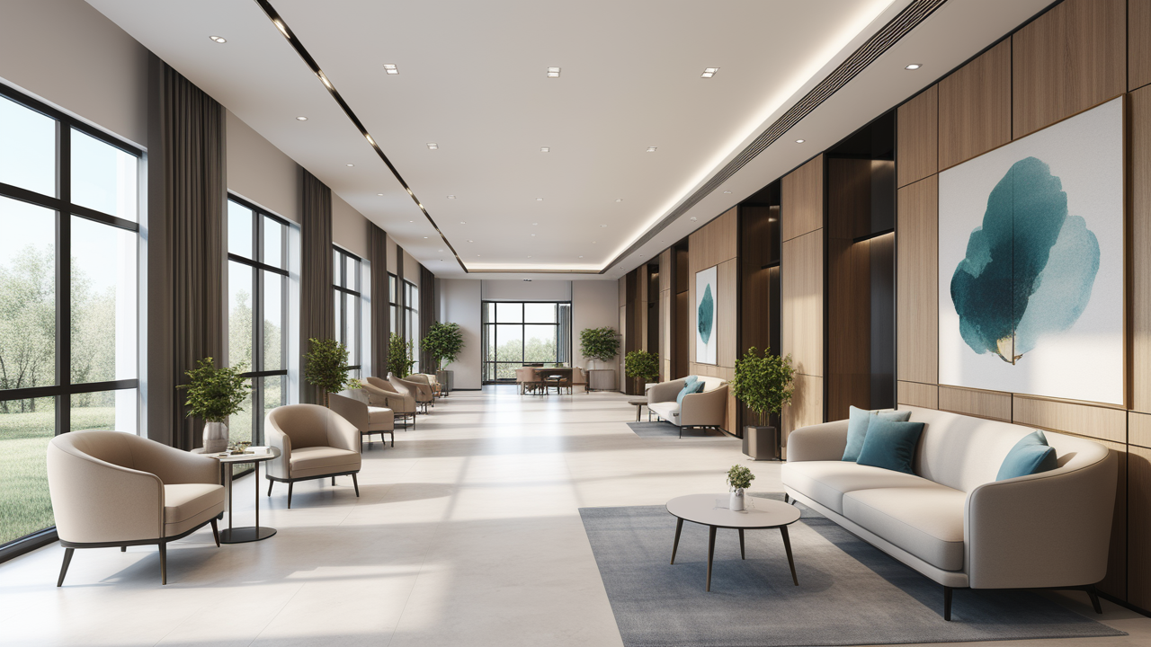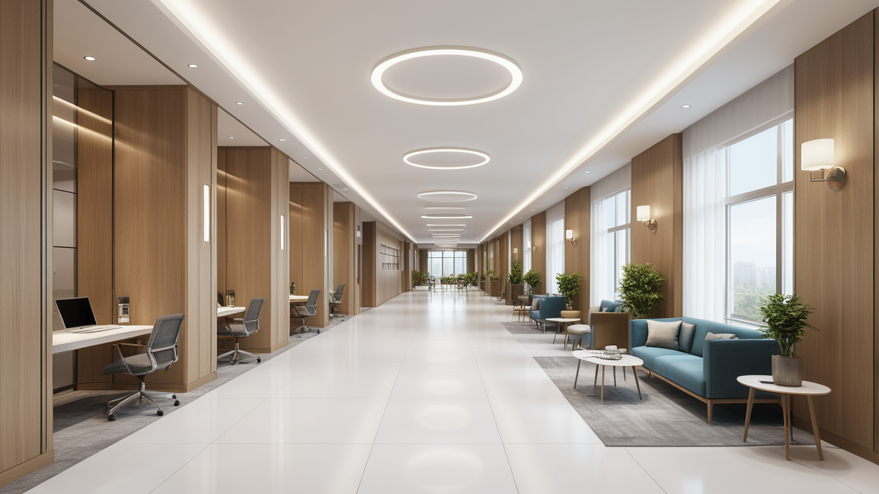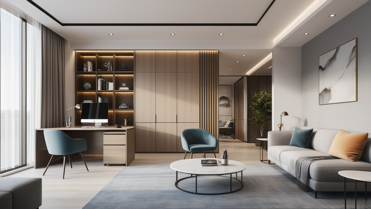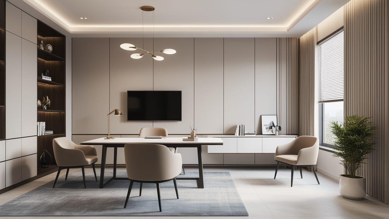 本案設(shè)計中考慮總經(jīng)理的辦公室空間布局時,因?qū)λ麨槿藝?yán)謹(jǐn)、負(fù)責(zé)、勤儉的優(yōu)良品行有所了解,特摒棄了一切繁文縟節(jié)的矯飾,一切盡在實用、明快而流暢的格局中;配合現(xiàn)代辦公環(huán)境的追求,設(shè)置實用與展示性相結(jié)合的整墻書柜,旁倚商務(wù)型老板桌,既陳設(shè)精雅、品味清亮、格調(diào)一致,又可于繁忙后賞窗外風(fēng)光、待客會友;簡潔的吊頂,照顧到了辦公、會客區(qū)的燈光劃分。