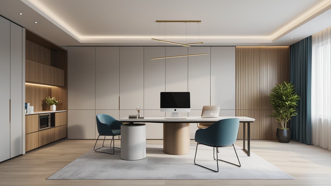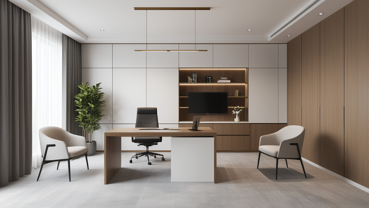本案在設計中因為空間較寬敞,加之衛生間門的開向正對室內,特設計了展示性隔斷柜,加強其辦公、會客及生活的區域性,既做到了空間上的劃分,又可通過展示柜內的擺設輔助室內布置呈現事業風貌及個人雅興,體現其穩重而時尚的人性化的特點。