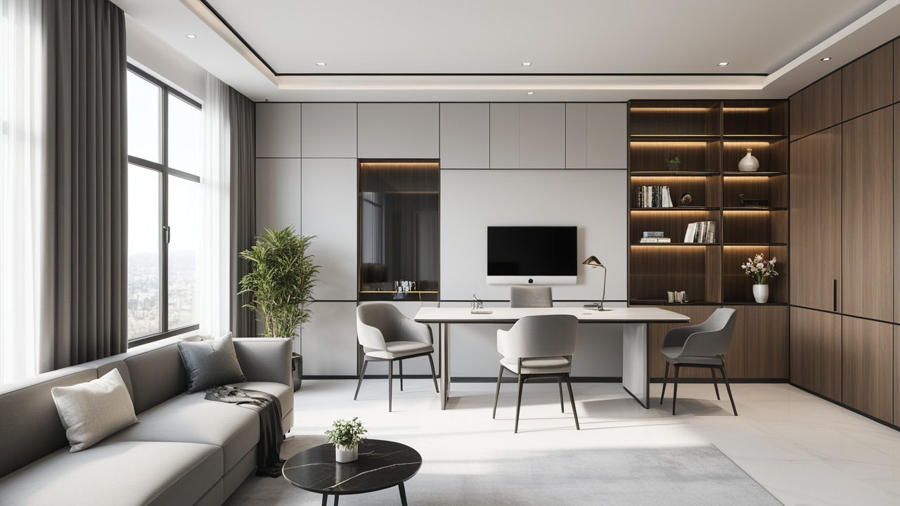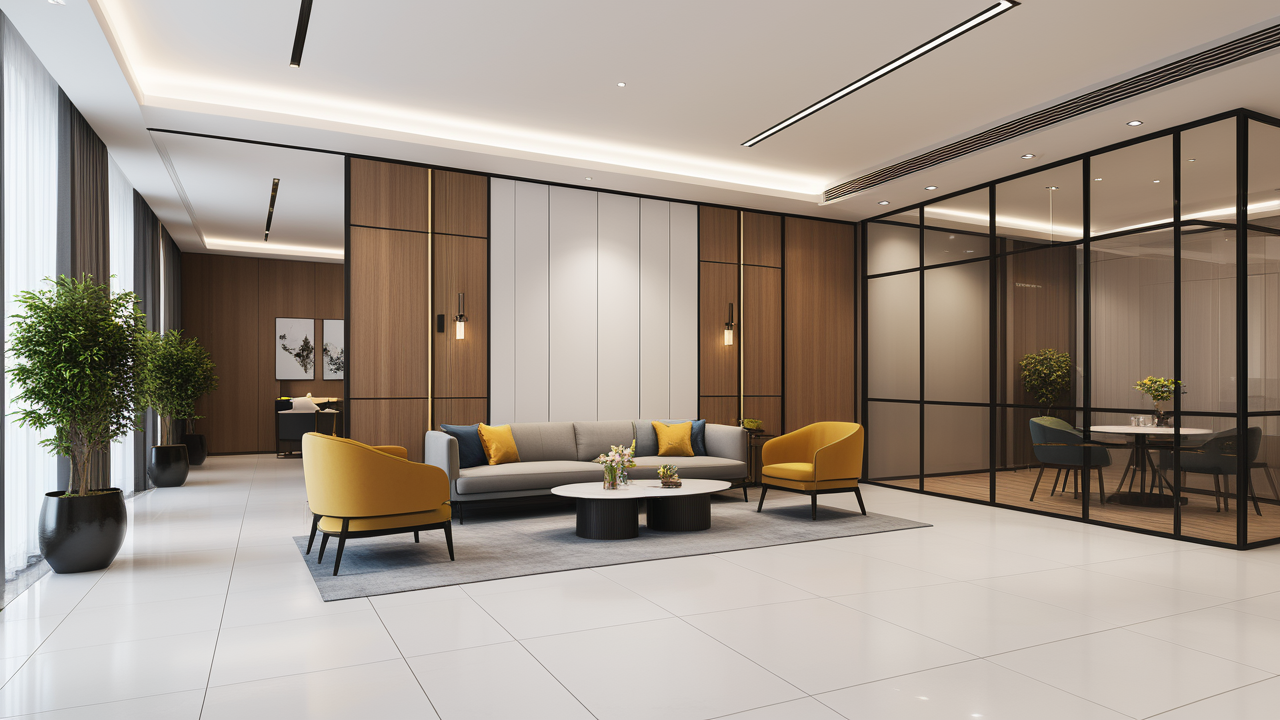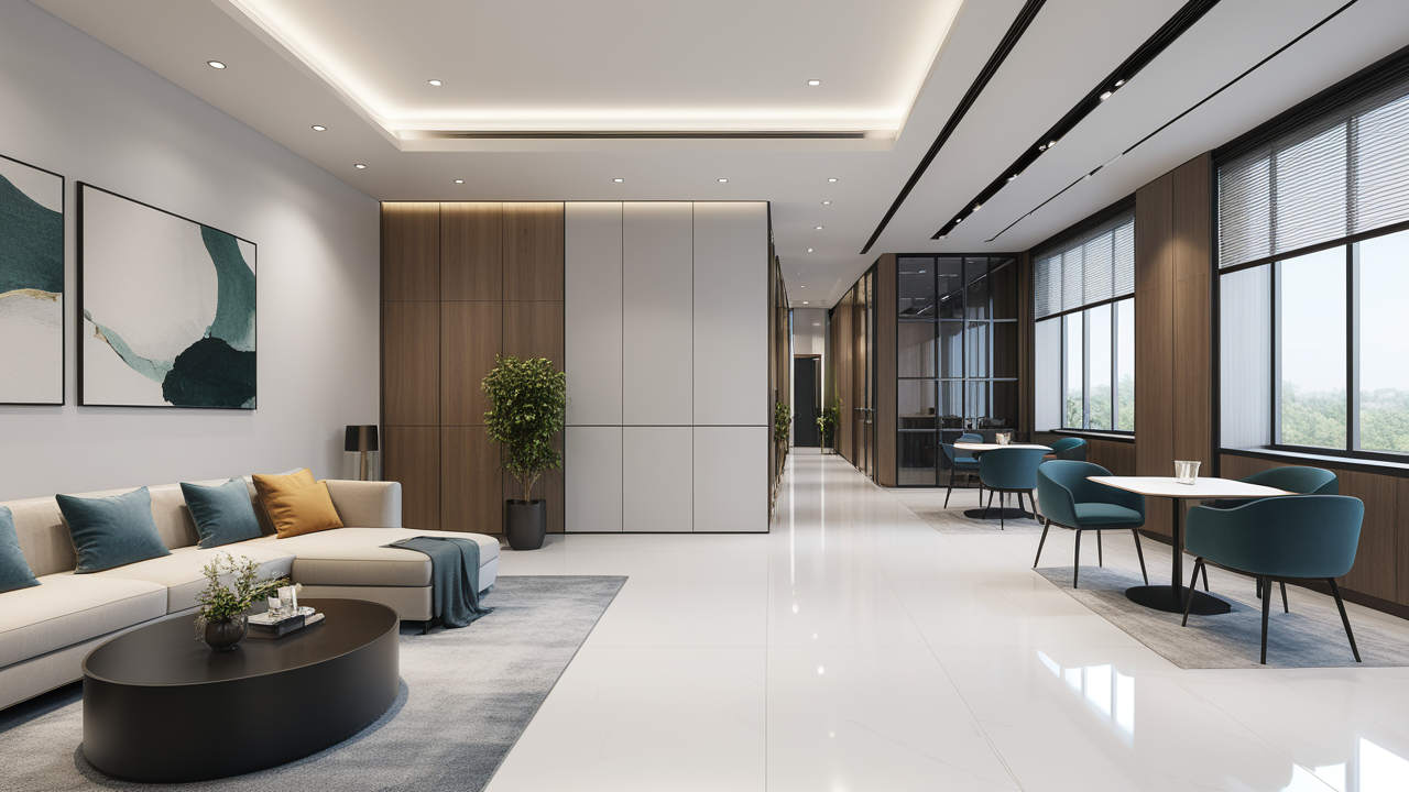 本案設計首先闖入眼簾的是企業形象墻,以其企業文化的新興、蓬勃、嚴謹為主題,兩側以“居有竹、步步高”的銀色墻柱帶來視覺沖擊感,加上企業形象色的類比色、淺色石材及不銹鋼條的運用,顯示出金屬的質感和工業文明的主題;華堂上方呼應以直線為主調、大筆勾勒而出的時尚型弧面吊頂,大直大方顯示出強烈的縱深感,加之以清透、明媚的光色渲染,工整氣派、大家風范,反襯出貴公司辦公樓的現代時尚特性,以干練快捷的設計節奏,展示出質量與效率并舉的時代精神。