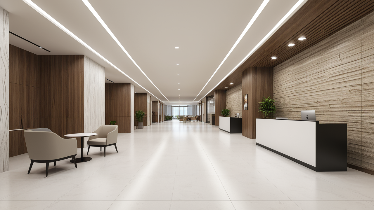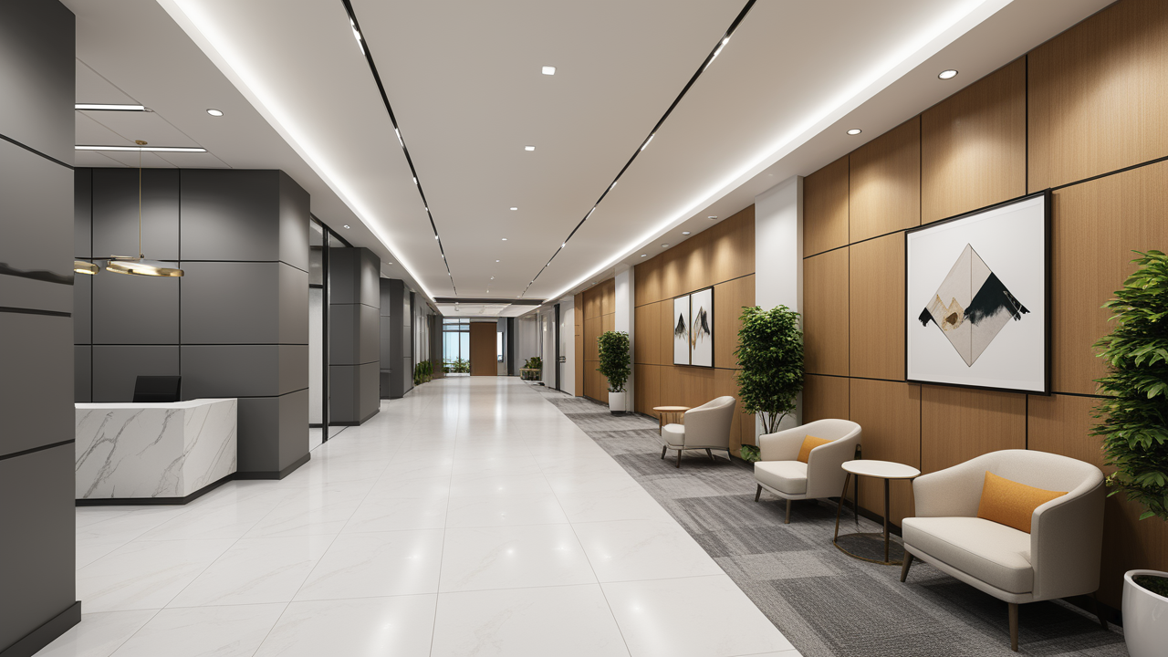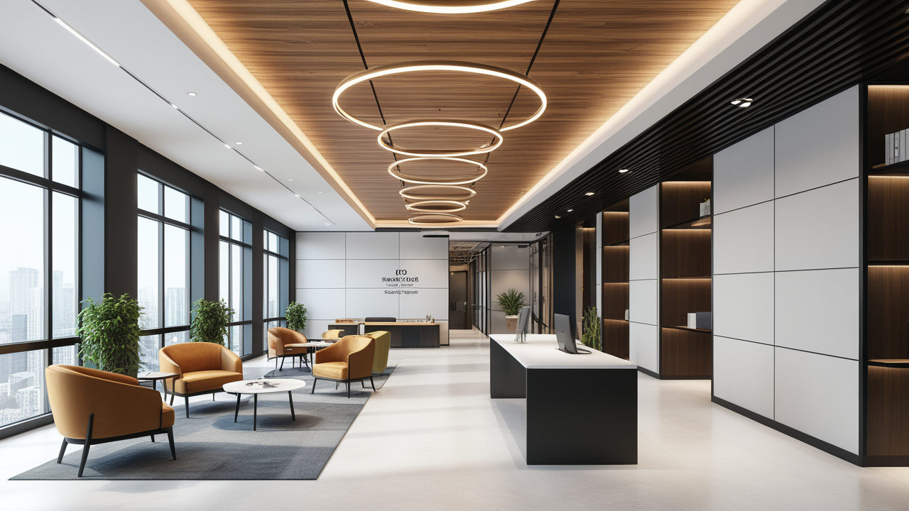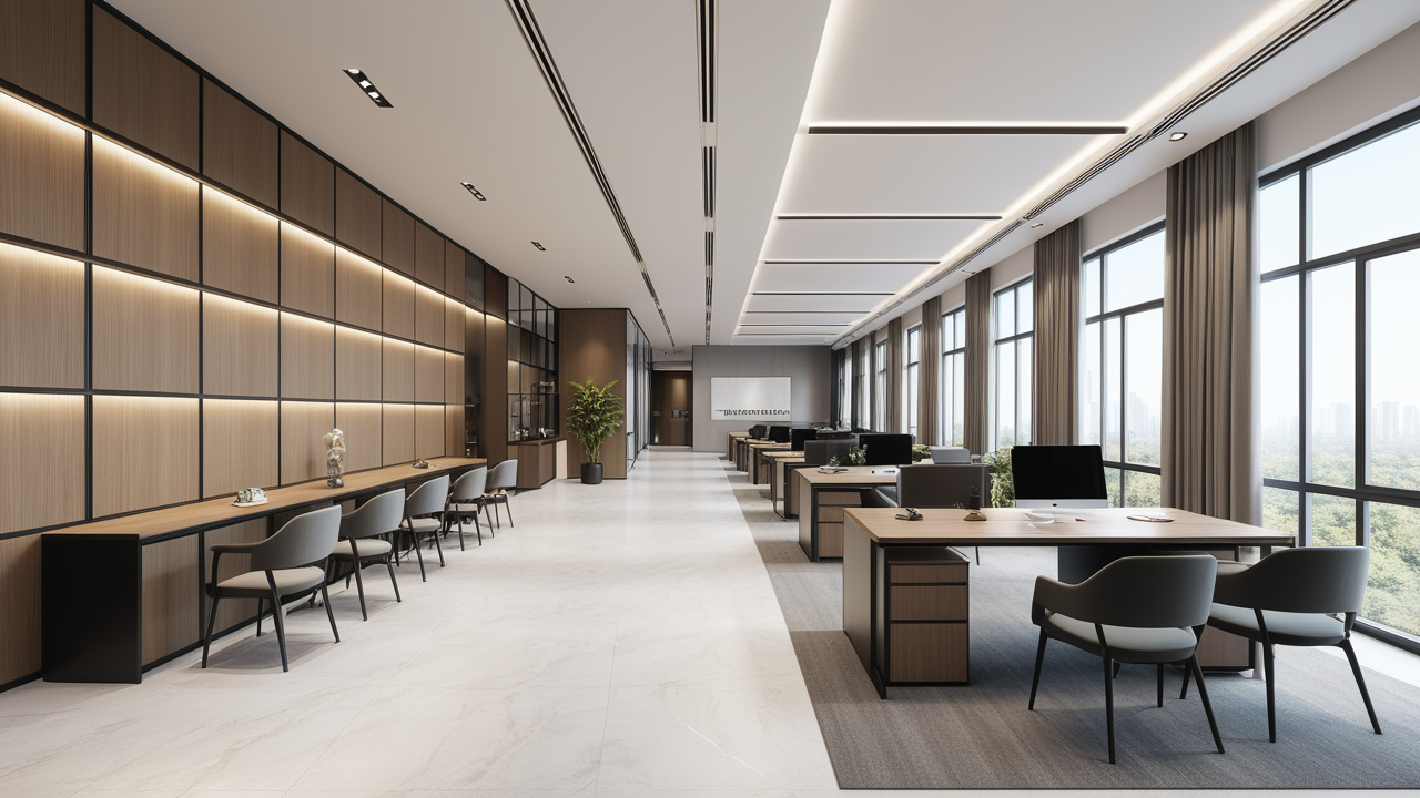 本案設(shè)計(jì)在處理上,特設(shè)計(jì)了可向客戶展示企業(yè)榮譽(yù)品的展示墻,用料實(shí)際,無(wú)須雕琢張揚(yáng),直線條的造型讓整個(gè)空間顯得穩(wěn)重大方,淺色系材料的運(yùn)用延續(xù)了靈動(dòng)而清澈的氣韻,大方莊重卻內(nèi)含現(xiàn)代時(shí)尚。而且色調(diào)淡雅的地毯、沙發(fā)、背景,還突出了接待廳親切、和睦、寬松的氛圍,使穩(wěn)靜而坦誠(chéng)的晤談氣氛盎然一室。